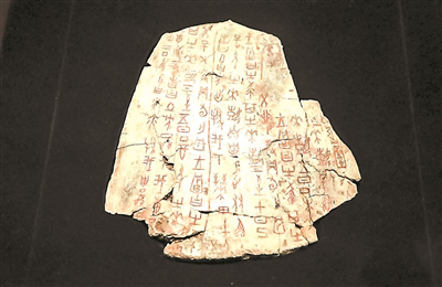 22日,“证古泽今——甲骨文文化展”在北京中国国家博物馆开幕。图为“土方征涂朱卜骨刻辞”