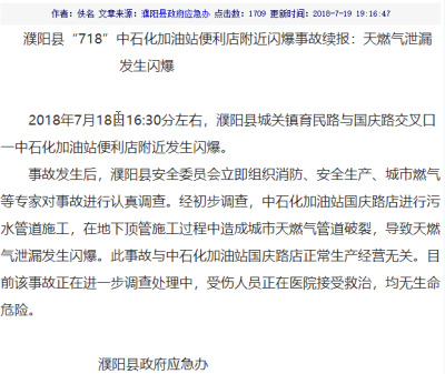 【真相】当天,濮阳县政府应急办发布公告。公告称,在爆炸事故中,有5人被震碎的玻璃划伤或烧伤,并被及时送往医院就医,“均无生命危险”。经濮阳县安全委员会组织专家调查,7月19日濮阳县政府发布事故续报称,事故原因是该加油站在污水管道的施工过程中,造成城市天然气管道破裂,导致天然气泄漏发生闪爆,与加油站的正常生产经营无关。目前,当地公安和网信部门已对该谣言进行了查证,并抓获造谣者一人,已对其处以行政拘留3日的处罚。