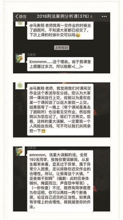 在许同学提出“风险共担”后,马寅翔在微信群中回复:“全班192名同学,独独你要误解我,从发生概率来看,显系过于异常,属于异常介入因素,足以排除你迟交作业的合理性,所以,让我背这个大锅,‘臣妾做不到啊’。”不过马寅翔随后提到,如果许同学能够找角度论证自己迟交的合理性,他就接受许同学的作业。