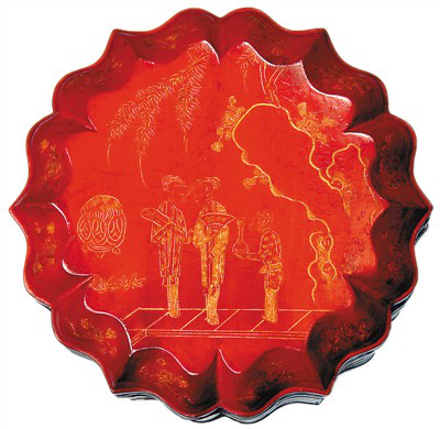南宋朱漆戗金莲瓣式人物花卉纹奁