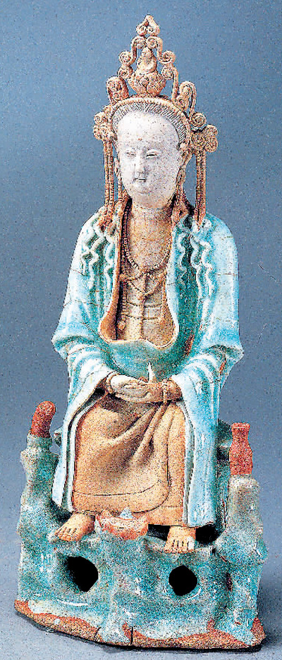 博物馆陈设中,有一处罗汉拓片环绕的佛教造像展橱,它的底本是常州千年古刹天宁寺的五百罗汉石刻像拓本,尊者表情丰富,形态多样,栩栩如生。橱窗里的一尊观音像格外醒目:头戴珠冠,外披通肩大衣,下着长裙,胸前佩挂璎珞串珠,腕戴珠钏,双臂搁于腿部,赤脚搁于宝座镂孔的台阶石上。观音两足之间有一莲花形插座,右边置一净瓶,左边塑一小鸟。此观音像雕琢十分精细,近看,每根指头上的指甲都清晰可见。据考证,这是南宋时期景德镇窑系的产品,属于当时的家居陈设瓷。不论是造型雕工,还是上色施釉,这尊观音像都体现了南宋景德镇窑最高工艺水平,是中国陶瓷艺术中不可多得的珍品。