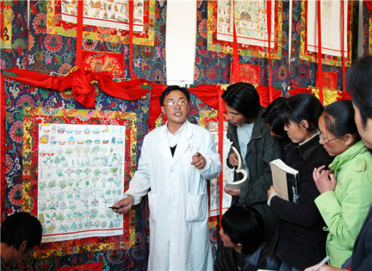藏医医生向学生介绍在古籍中记载的用于药浴的草药。教科文组织提供