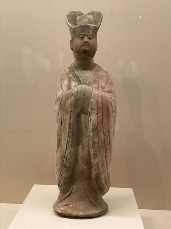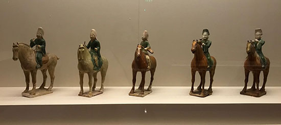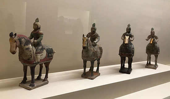 文官与武官俑代表了唐朝的文武官制度。展品中还有一组彩绘贴金骑马俑,骑士与马均身披铠甲,这也反映出当时已有轻骑兵参与作战。