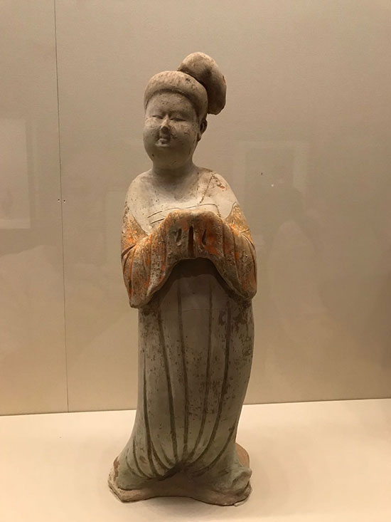 众所周知,唐朝女性崇尚“以胖为美”,然而“胖”并不是有唐一代从始至终的审美取向,初唐、中唐和晚唐基本还是以清瘦为美。对比唐初与唐中期的女性俑展品来看,唐初女性俑的身形明显瘦于唐中期。