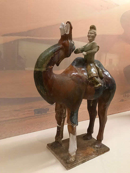 引人注目的还有高鼻深目,头戴尖顶帽,身穿开领衣的胡人,骑着满载货物负重而行的骆驼,在迢迢旅途中披星戴月、风餐露宿,一幅匆匆而来的行商模样。这些商人和骆驼陶俑一起成为丝绸之路经济文化交流的象征性符号。
