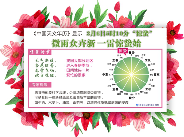 新华社天津3月3日电(记者周润健)“微雨众卉新,一雷惊蛰始”,《中国天文年历》显示,3月6日5时10分迎来“惊蛰”节气。此时节,天气渐暖,杏花绽蕾,春雷乍响,蛇虫惊醒,我国大部分地区进入春耕季节,田间地头一片繁忙的景象。