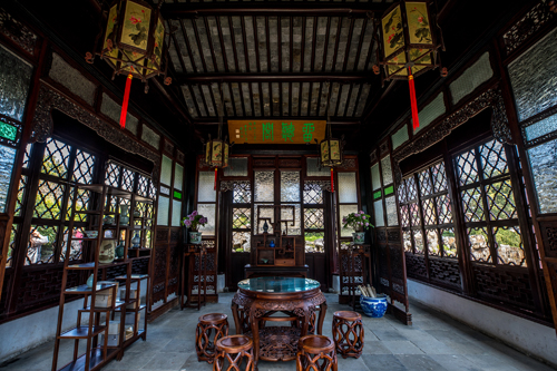 此外,拙政园中的荷风四面亭中有抱柱联:“四壁荷花三面柳,半潭秋水一房山”。全联句式仿济南大明湖历下亭刘凤诰所撰名联:“四面荷花三面柳,一城山色半城湖。”出句改“面”为 “壁”,对句则化用唐李洞《山居喜故人见访》诗“看待诗人无别物,半潭秋水一房山”。该联用一、二、三、四串起春夏秋冬景致,精妙无比。“一房山”指树叶凋零、山形倒影于池中之冬景;“半潭秋水”自是秋天;“三面柳”即春色,“四壁荷花”乃夏景,在此亭中,恰可领略园林四季之美。