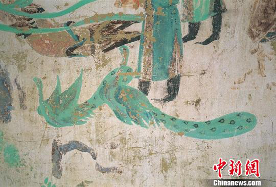 图为莫高窟332窟中绘于初唐的“双孔雀” 。 敦煌研究院供图