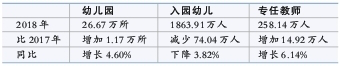 尽管,受到人口自然出生率下降的影响,在园幼儿人数递增趋势减缓的情况下,2018年较2017年学前教育入园幼儿人数降低了3.82%,但是,我国幼儿园数量和幼儿教师数却呈现持续递增,其中幼儿园教职工和幼儿园教师数都分别达8.08%和6.14%的递增。