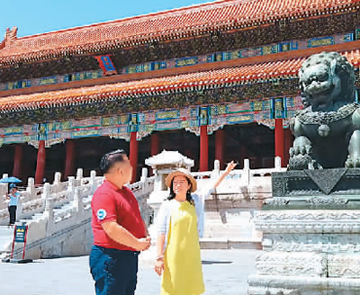 北京语言大学中华文化国际传播中心主任助理、副教授岳岩(右)带领华裔青少年“云游”故宫。