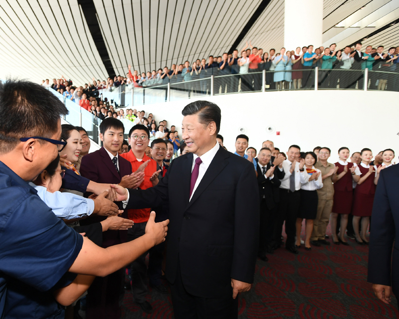 投运仪式结束后,习近平来到机场国际出发大厅,看望参与机场建设和运营的工作人员代表。习近平同大家一一握手,代表党中央向大家并向所有参与机场规划、建设、运营的同志们表示热烈的祝贺和节日的问候。习近平指出,大兴国际机场建设标准高、建设工期紧、施工难度大,全体建设者辛勤劳动、共同努力,高质量地完成了任务,把大兴国际机场打造成为精品工程、样板工程、平安工程、廉洁工程,向党和人民交上了一份令人满意的答卷!