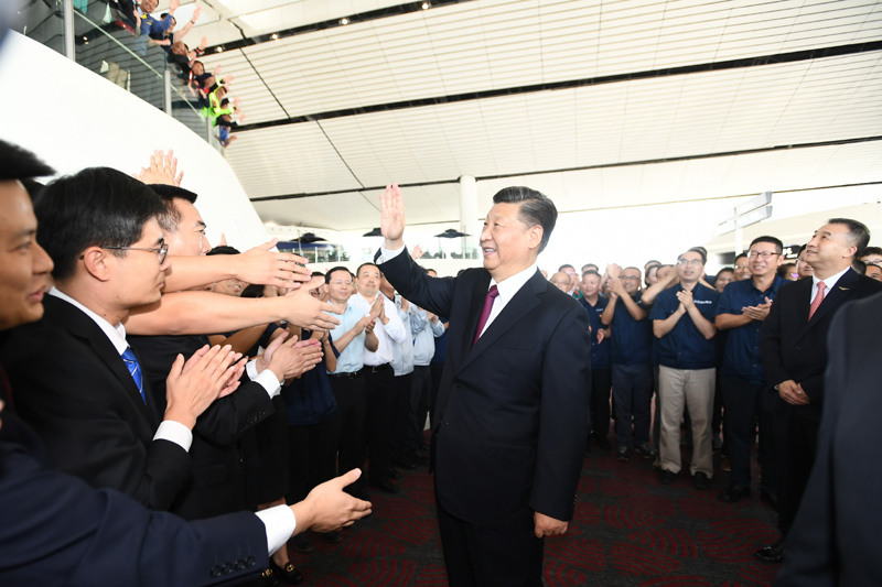 9月25日上午,北京大兴国际机场投运仪式在北京举行。中共中央总书记、国家主席、中央军委主席习近平出席仪式,宣布机场正式投运并巡览航站楼。这是习近平看望参与机场建设和运营的工作人员代表,同他们亲切交谈。新华社记者 鞠鹏 摄