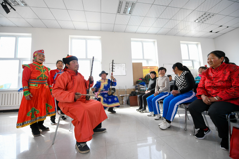 内蒙古兴安盟科尔沁右翼中旗巴彦敖包嘎查的蒙古族村民在乡村文化活动室演唱民族歌曲(2019年4月17日)。新华社记者 彭源 摄