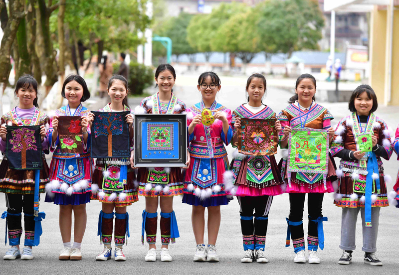 在广西融水苗族自治县民族中学,女童班的学生在展示刺绣作品(2019年3月22日摄)。新华社记者 黄孝邦 摄