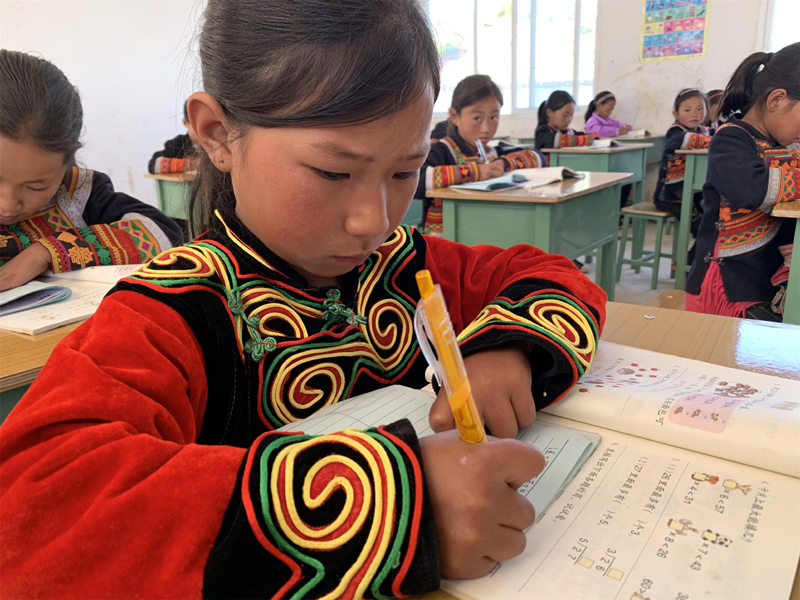 一名小女孩在四川凉山彝族自治州美姑县马依村的学校里上课(2019年5月16日摄)。新华社记者 陈地 摄