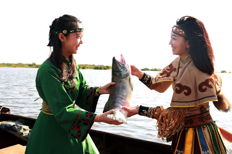 在黑龙江抚远市乌苏镇抓吉赫哲族民俗村,两名赫哲族女子在查看刚刚从乌苏里江中捕捞上来的大马哈鱼(2018年9月13日摄)。新华社记者 潘旭 摄