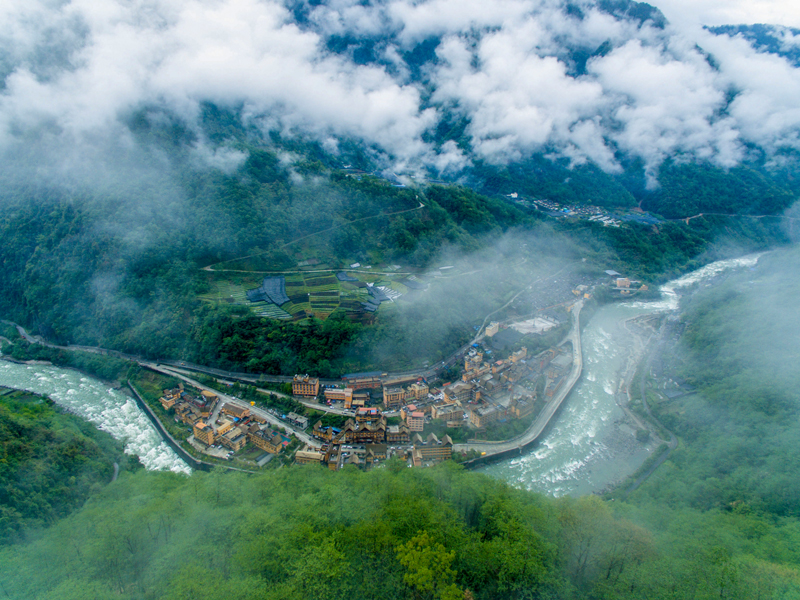 云雾缭绕的云南贡山独龙族怒族自治县独龙江乡(2019年4月16日无人机拍摄)。新华社记者 江文耀 摄