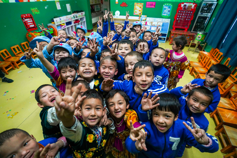 新疆和田地区于田县先拜巴扎镇良种场村的幼儿园里,孩子们在一起玩耍(2019年2月13日摄)。新华社记者 赵戈 摄