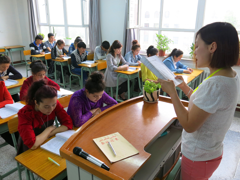 在新疆和田师范专科学校,早读期间,维吾尔语专业的程静在给汉语专业2015级二班学生领读汉语课文(2016年4月19日摄)。新华社记者 蔡国栋 摄