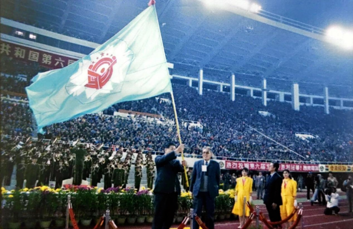 六运会闭幕式上进行会旗交接(来源:《中国十运:1—10届全运会精彩回眸》)