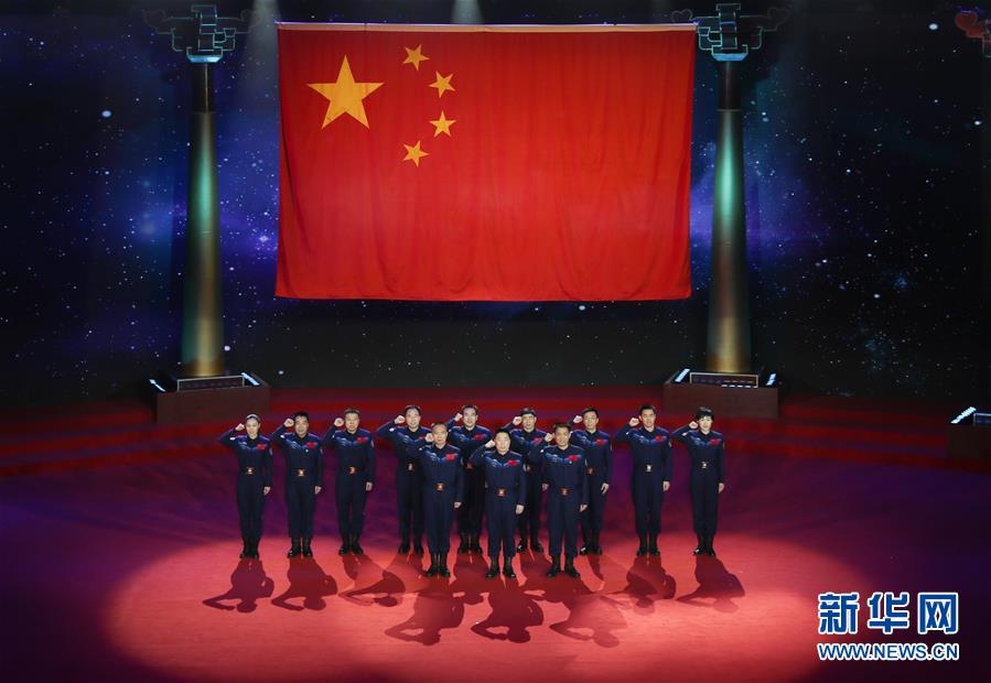 12名航天员代表在发布仪式现场庄严宣誓(1月15日摄)。