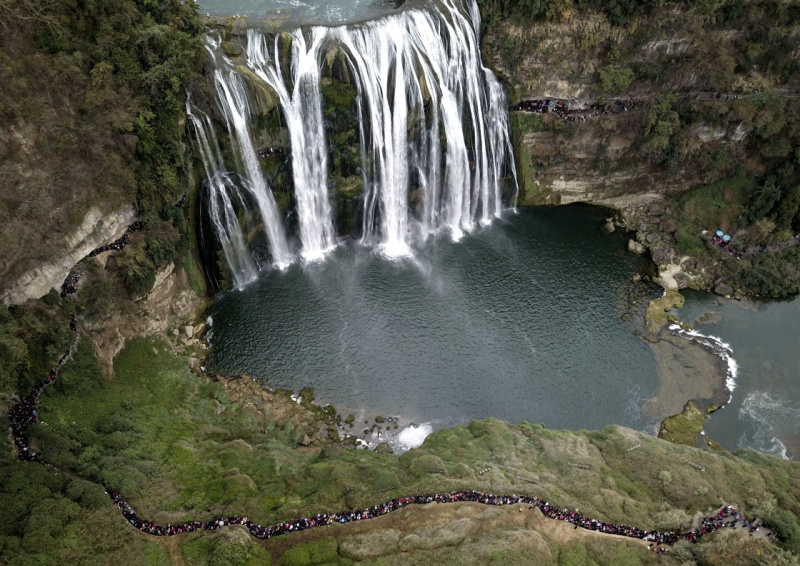 2月21日,游客在贵州安顺黄果树瀑布景区观光游览。