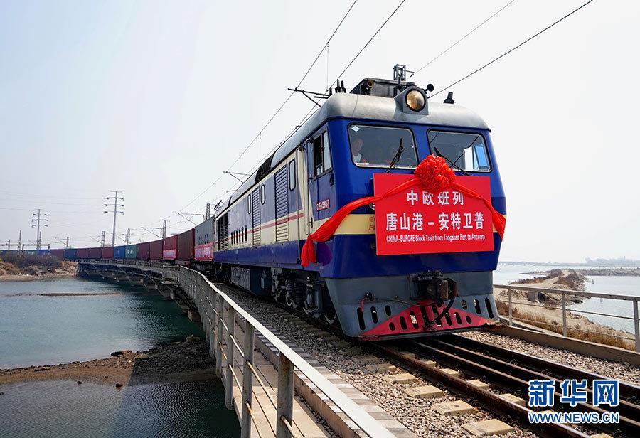 发往比利时安特卫普的国际集装箱班列从河北唐山港京唐港区驶出(4月26日摄)。唐山港京唐港区当日正式开通中欧国际集装箱班列。新华社记者 杨世尧 摄