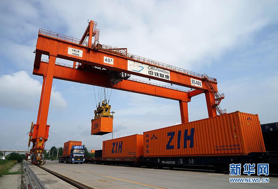 在郑州铁路集装箱中心站,工作人员使用大型门吊为中欧班列(郑州)装载货物(2017年8月2日摄)。新华社记者 李安 摄