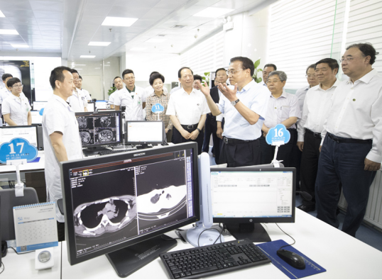 在银川市第一人民医院,李克强听取了宁夏开展“互联网+医疗健康”工作汇报,银川智慧互联网医院覆盖了全区所有社区乡镇,实现了远程诊断。李克强与联合诊疗患者的社区医生和北京专家在线交流,勉励他们当好群众健康守护者。李克强说,运用“互联网+”促进重点民生领域改善潜力巨大。要以习近平新时代中国特色社会主义思想为指导,坚持以人民为中心的发展思想,按照党中央、国务院部署,深入推动“互联网+”行动,让那些目前难以直接配置更多优质资源的基层和贫困地区的群众,也能更方便获得好的公共服务,这有利于促进公平。他希望宁夏在创建“互联网+医疗健康”示范区上走在前列,惠及各族群众及周边地区,国家会积极支持。