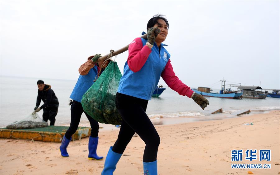 广西北海市铁山港区旺海珍珠养殖场珠农在抬运收获的马氏珠母贝(2017年12月7日摄)。新华社记者 张爱林 摄