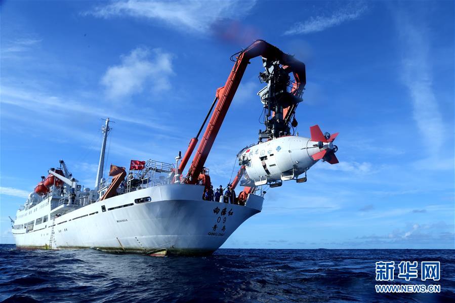 “蛟龙”号载人潜水器进入水中,进行中国大洋38航次最后一潜(2017年6月13日摄)。新华社记者 刘诗平 摄