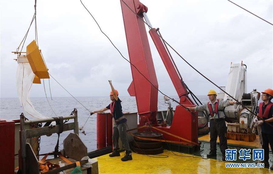 中国第34次南极科学考察队队员用“雪龙”号后甲板的绞车和A型架等设备将微塑料采样器放入海中(2017年11月19日摄)。 新华社记者 白国龙 摄