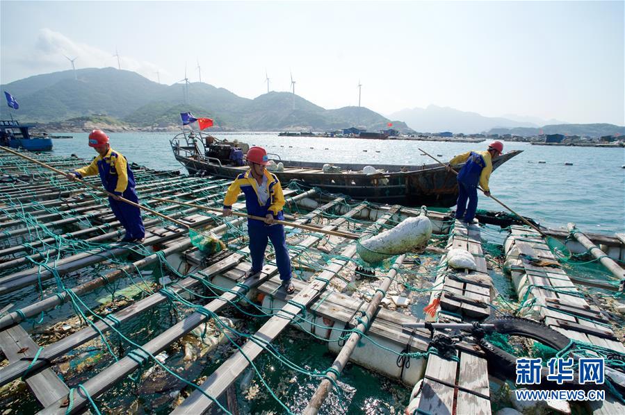 福建省连江县黄岐镇海上环卫工人在清理渔排内的海漂垃圾(2017年6月6日摄)。新华社记者 姜克红 摄