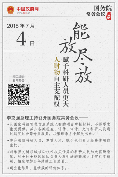 当天会议确定进一步扩大科研人员自主权的措施。李克强指出,要落实习近平总书记在两院院士大会上的重要讲话精神,按照党中央、国务院部署,深化科技领域“放管服”改革,按照能放尽放的要求赋予科研人员更大的人财物自主支配权,充分调动他们的积极性,激发创新活力,壮大经济发展新动能。