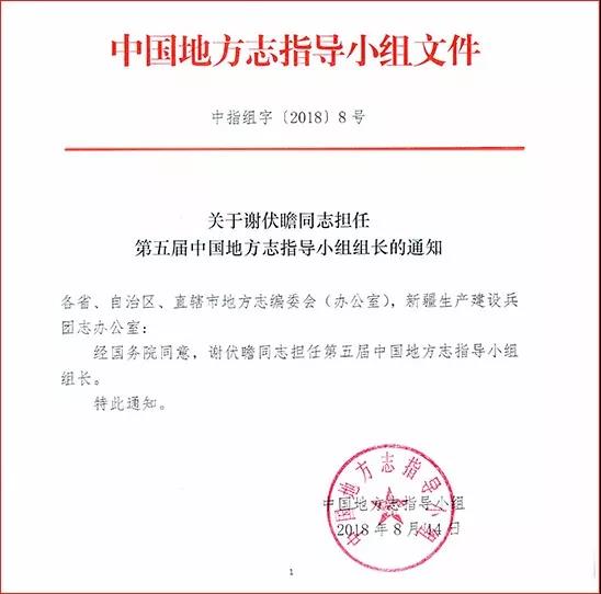2018年8月14日,中国地方志指导小组印发《关于谢伏瞻同志担任第五届中国地方志指导小组组长的通知》(中指组字〔2018〕8号):经国务院同意,谢伏瞻同志担任第五届中国地方志指导小组组长。特此通知。