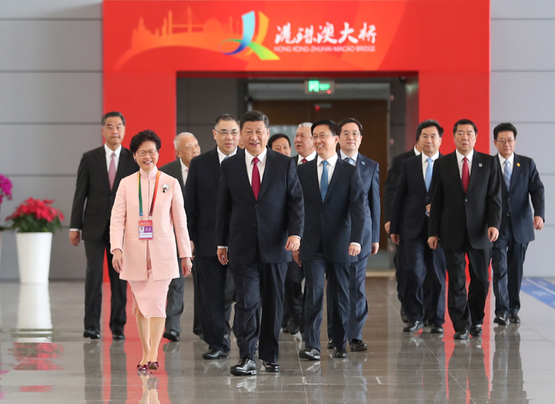 10月23日上午,港珠澳大桥开通仪式在广东省珠海市举行。中共中央总书记、国家主席、中央军委主席习近平出席仪式,宣布大桥正式开通并巡览大桥。这是习近平等步入仪式现场。新华社记者 谢环驰 摄