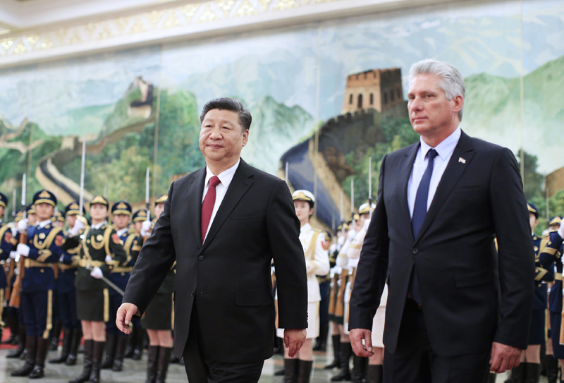 11月8日,国家主席习近平在北京人民大会堂同古巴国务委员会主席兼部长会议主席迪亚斯-卡内尔举行会谈。这是会谈前,习近平在人民大会堂北大厅为迪亚斯-卡内尔举行欢迎仪式。新华社记者 王晔 摄