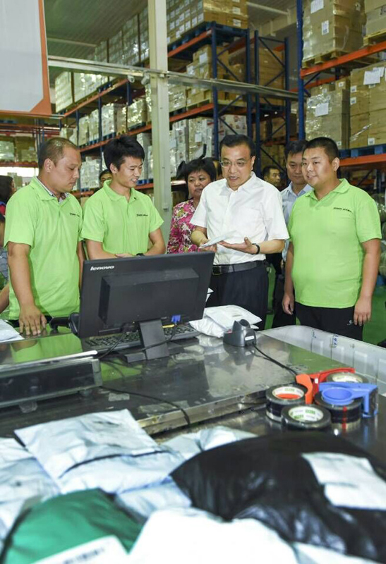 图为李克强在河南保税物流中心,考察在当地开展业务的跨境电商。
