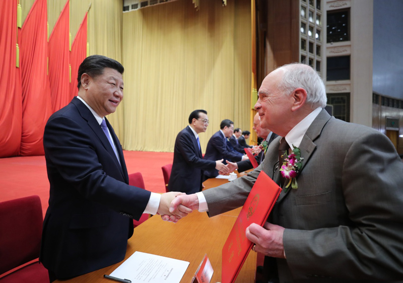 1月8日,2018年度国家科学技术奖励大会在北京人民大会堂隆重举行。这是习近平等党和国家领导人同获得2018年度国家最高科学技术奖的哈尔滨工业大学刘永坦院士和中国人民解放军陆军工程大学钱七虎院士一道,为获得国家自然科学奖、国家技术发明奖、国家科学技术进步奖和中华人民共和国国际科学技术合作奖的代表颁发证书。新华社记者 鞠鹏 摄