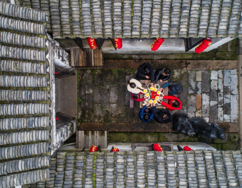1月29日,村民丁连庆一家在义皋村老屋的天井内吃团圆饭(无人机拍摄)。