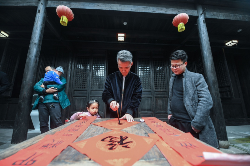 1月29日,书法爱好者在义皋村老屋的天井内书写“福”字。