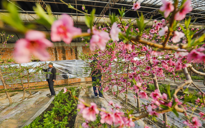 2月11日,河北唐山遵化市西三里乡西三里村农民在大棚内劳作。