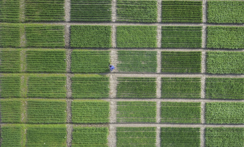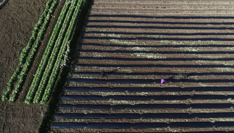 2月25日,人们在江苏里下河地区农科所(扬州农科院)的田里劳作(无人机拍摄)。