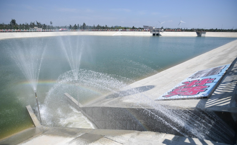 福建向金门供水工程实现正式通水,来自福建的清水流进金门田埔水库旁的受水池(2018年8月5日摄)。新华社记者 薛玉斌 摄