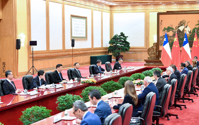 习近平指出,智利是第一个同新中国建交的南美国家,也是第一个承认中国完全市场经济地位、同中国签署双边自由贸易协定并实现升级的拉美国家,是共建“一带一路”的重要合作伙伴,中智关系长期走在中拉关系前列。我们要继续发扬敢为人先的精神,以共建“一带一路”为新契机,深化政治互信和务实合作,推动中智全面战略伙伴关系迈上新台阶。双方要对接发展战略,确定重点领域和项目,促进智利和拉美地区互联互通。要推动双边贸易和投资提质升级,加强在矿业、清洁能源、信息通信、电子商务、科技创新、南极科考等领域合作。要办好明年两国建交50周年系列庆祝活动,促进民心相通。中方支持智方主办今年联合国气候变化大会和亚太经合组织领导人非正式会议,共同推动亚太自由贸易区建设,维护多边主义和多边贸易体制。