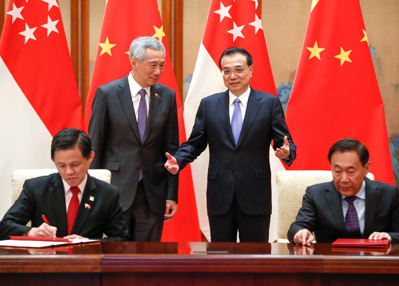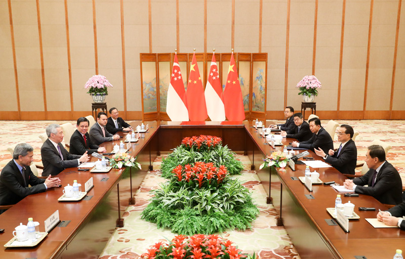 李克强表示,近年来,中新关系的持续健康稳定发展增进了两国人民福祉,去年双方领导人达成的共识正在逐步落实,中新自贸协定升级的积极效应得到显现,各领域合作稳步推进,新加坡连续6年成为中国第一大新增外资来源国。中方愿同新方打造好“陆海新通道”,推进金融、第三方市场、科技创新、智慧城市等领域合作。我们愿同新方共同努力,加快“区域全面经济伙伴关系协定”(RCEP)谈判进程,按照既定目标完成“南海行为准则”(COC)磋商,深化双方在中国—东盟等机制内的合作,促进本地区实现稳定、发展与繁荣。