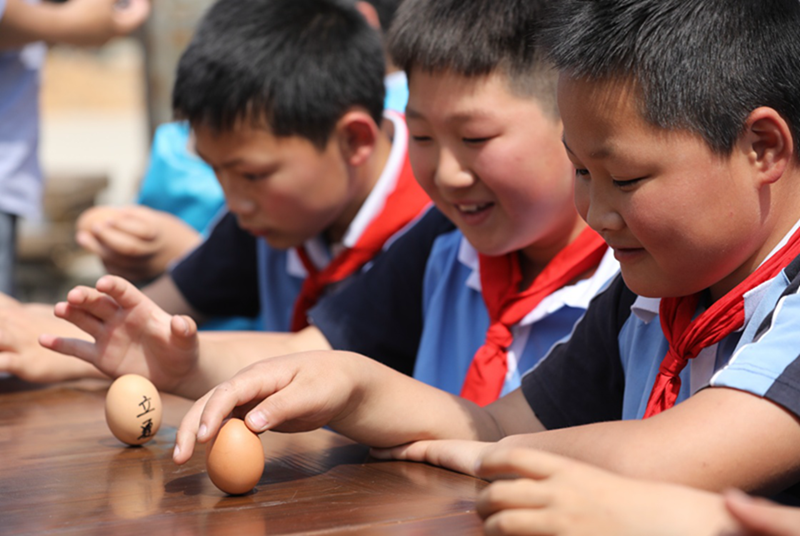 5月5日,在浙江杭州临安区天目山镇武山村,几名小学生在体验“立蛋”的传统习俗。