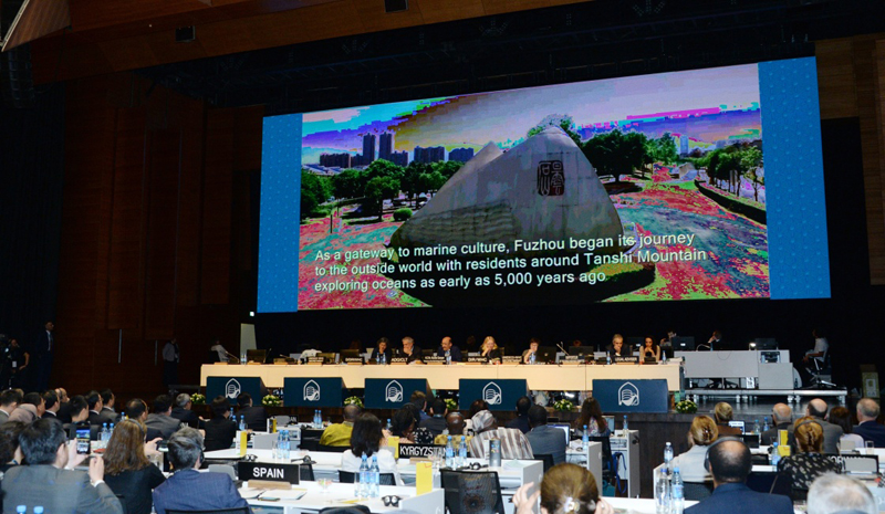 7月9日,在阿塞拜疆巴库,第43届世界遗产大会现场介绍下一届大会举办地中国福州。