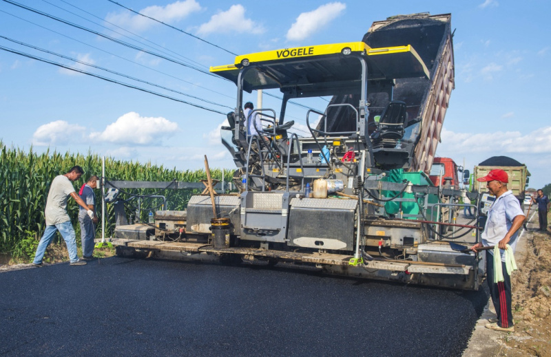 8月15日,在河北省枣强县大营镇南石村,工人在操作铺路机铺设农村公路。