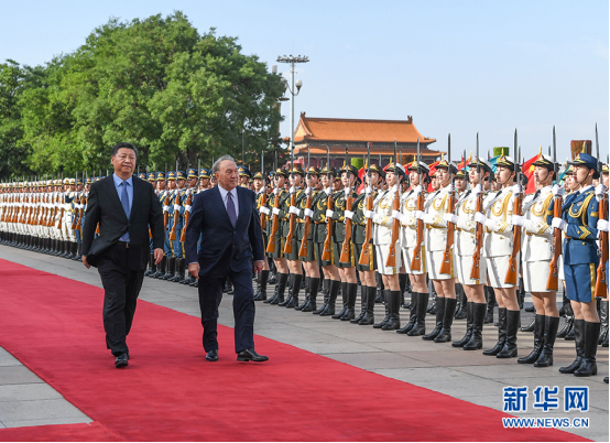6月7日,国家主席习近平在北京人民大会堂同哈萨克斯坦总统纳扎尔巴耶夫举行会谈。这是会谈前,习近平在人民大会堂东门外广场为纳扎尔巴耶夫举行欢迎仪式。新华社记者 姚大伟 摄
